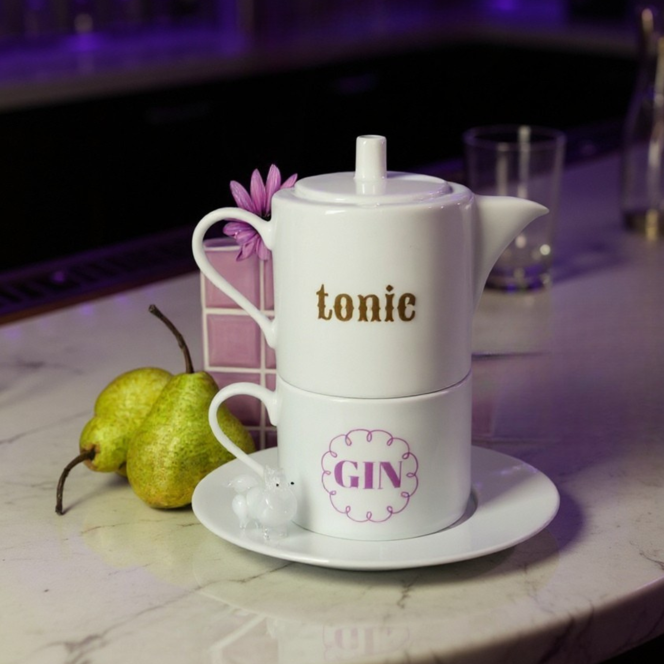 Porcelanowy zestaw, w którym wszystko do siebie idealnie pasuje: duży spodek, pojemna filiżanka i dopasowany dzbanek, który siada na niej jak ulał.